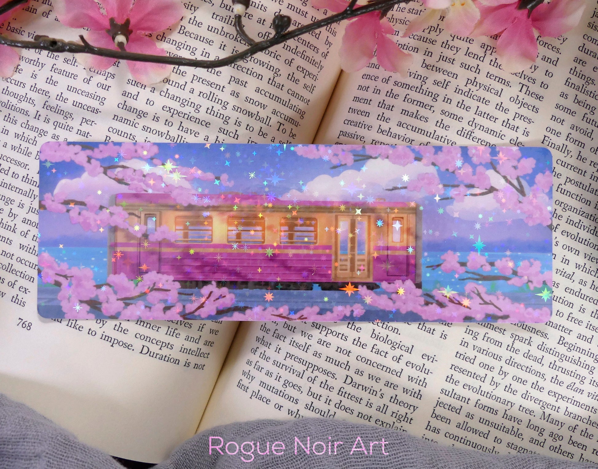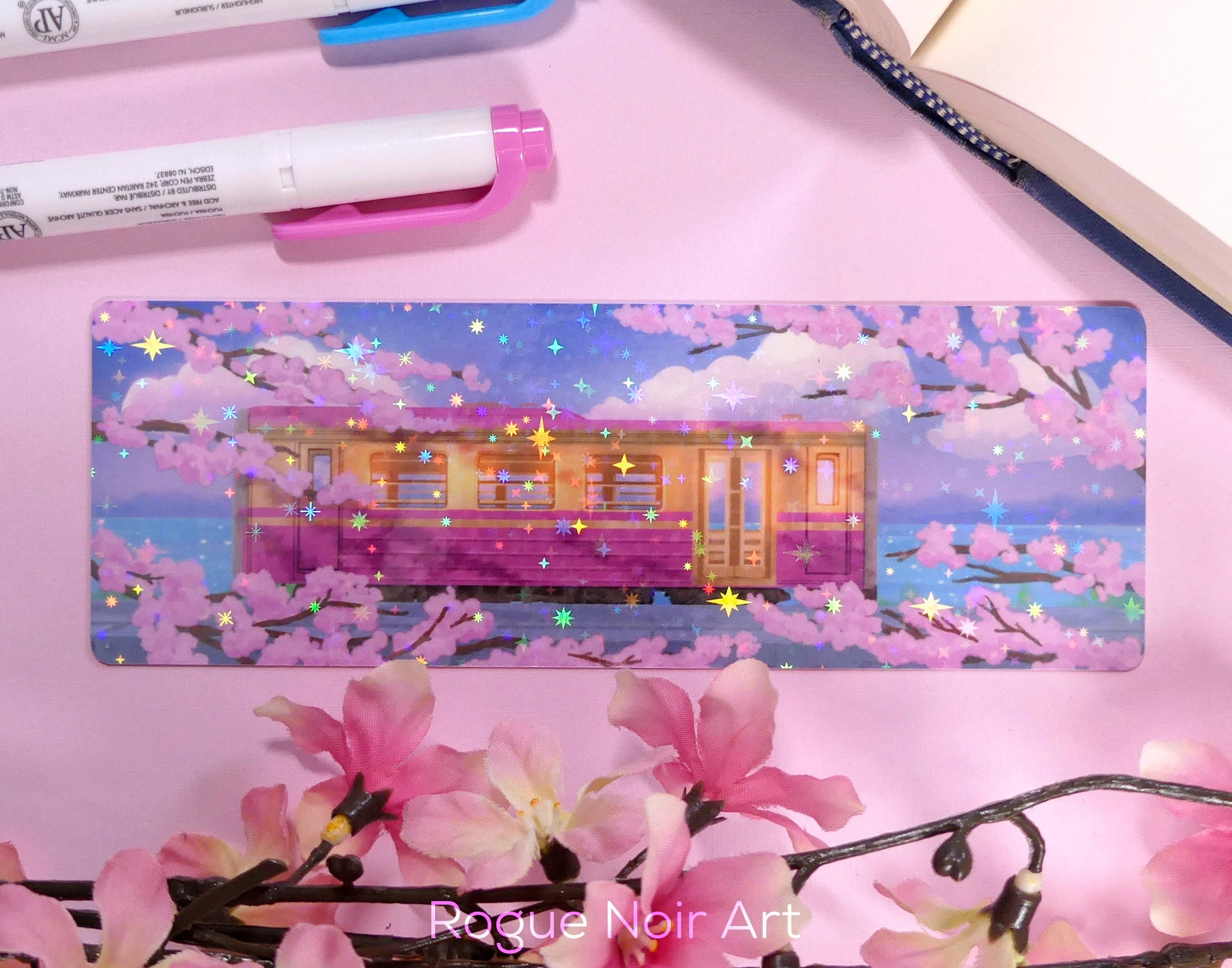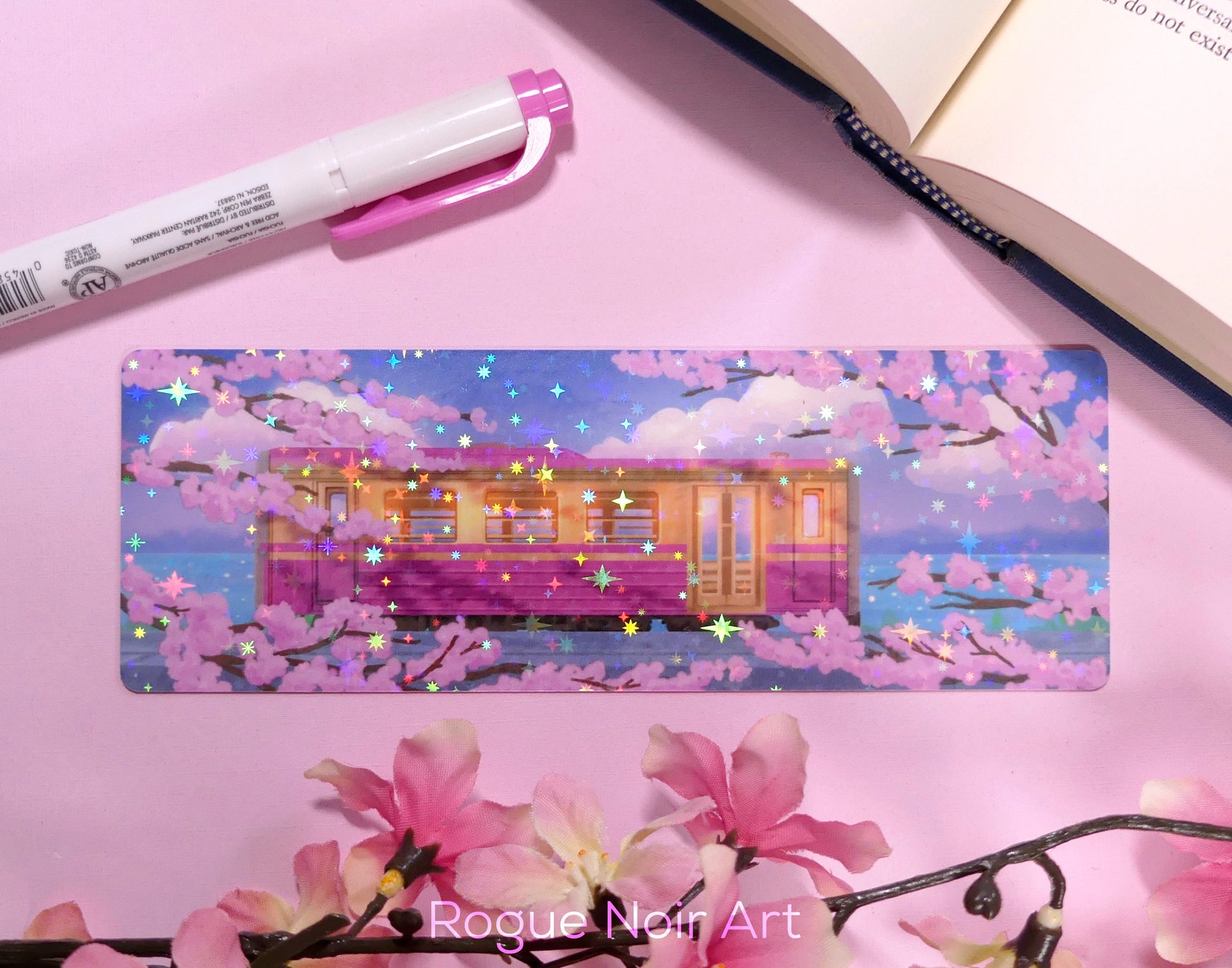 This bookmark features a Japanese-style train moving through a sakura-covered scene. Measures 6x2.15 inches and finished with a sparkling holographic finish. Single-sided design.