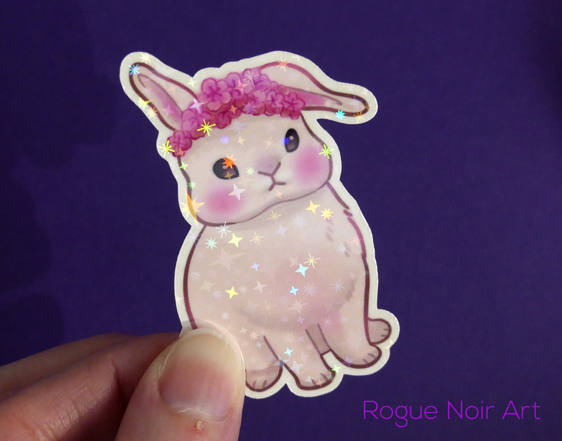 These cute bunny vinyl stickers were illustrated by me and come in two laminated finishes: soft matte or sparkling holographic. Dimensions: 2.25 inches high x 1.25 inches wide. She's ready for Spring and is even wearing a flower crown of cherry blossoms.