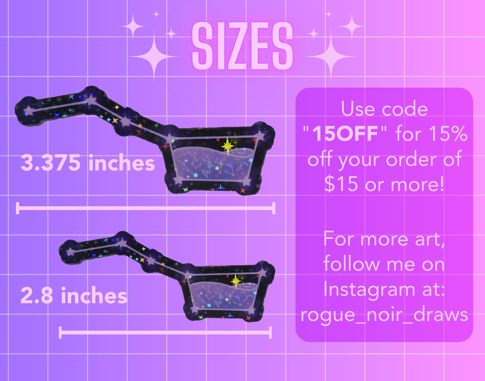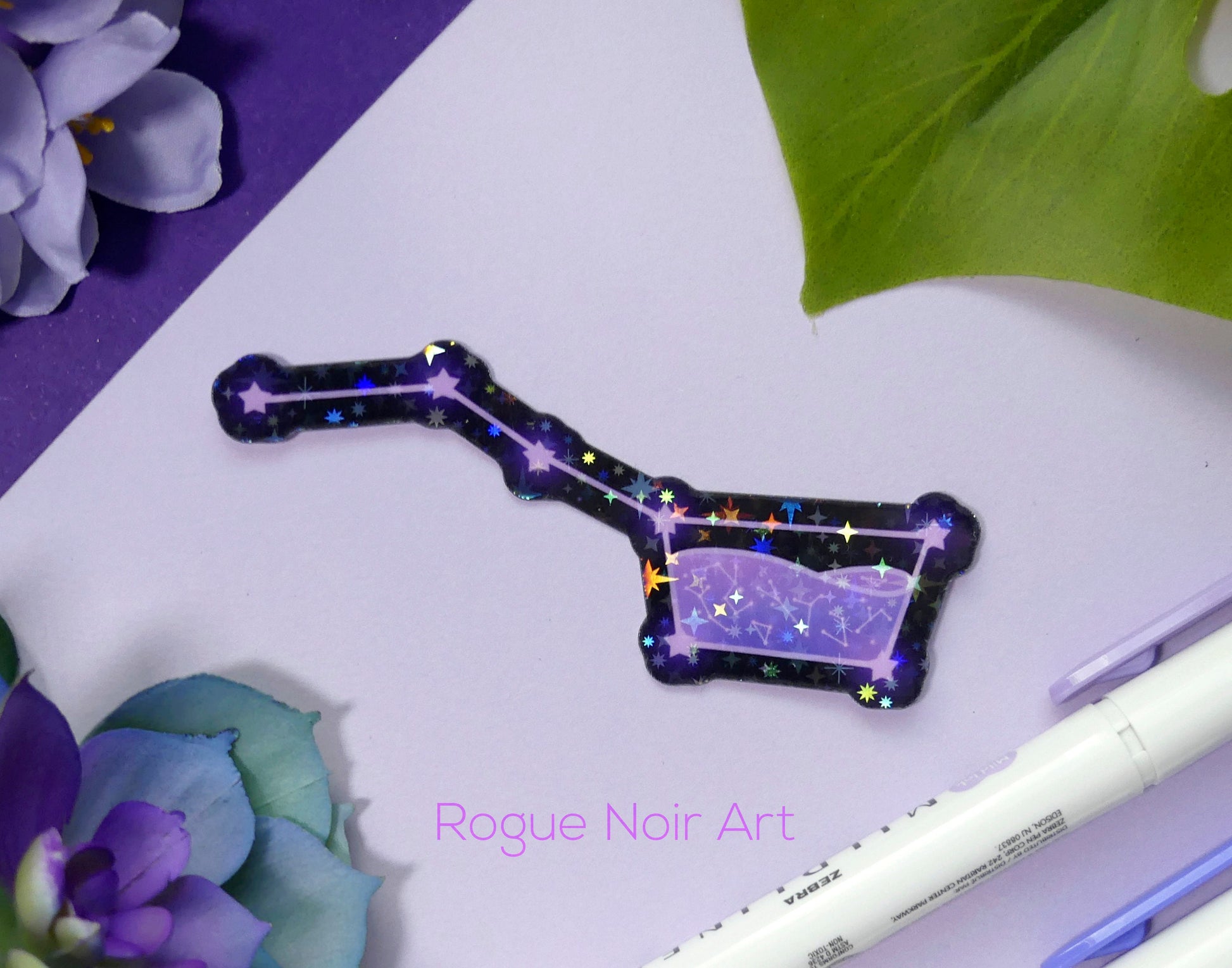 This holographic sticker depicts a dreamy version of the Big Dipper in soft pastel purple tones. Comes in two sizes: Small: 2.8 inches wide or Large, 3.4 inches wide.