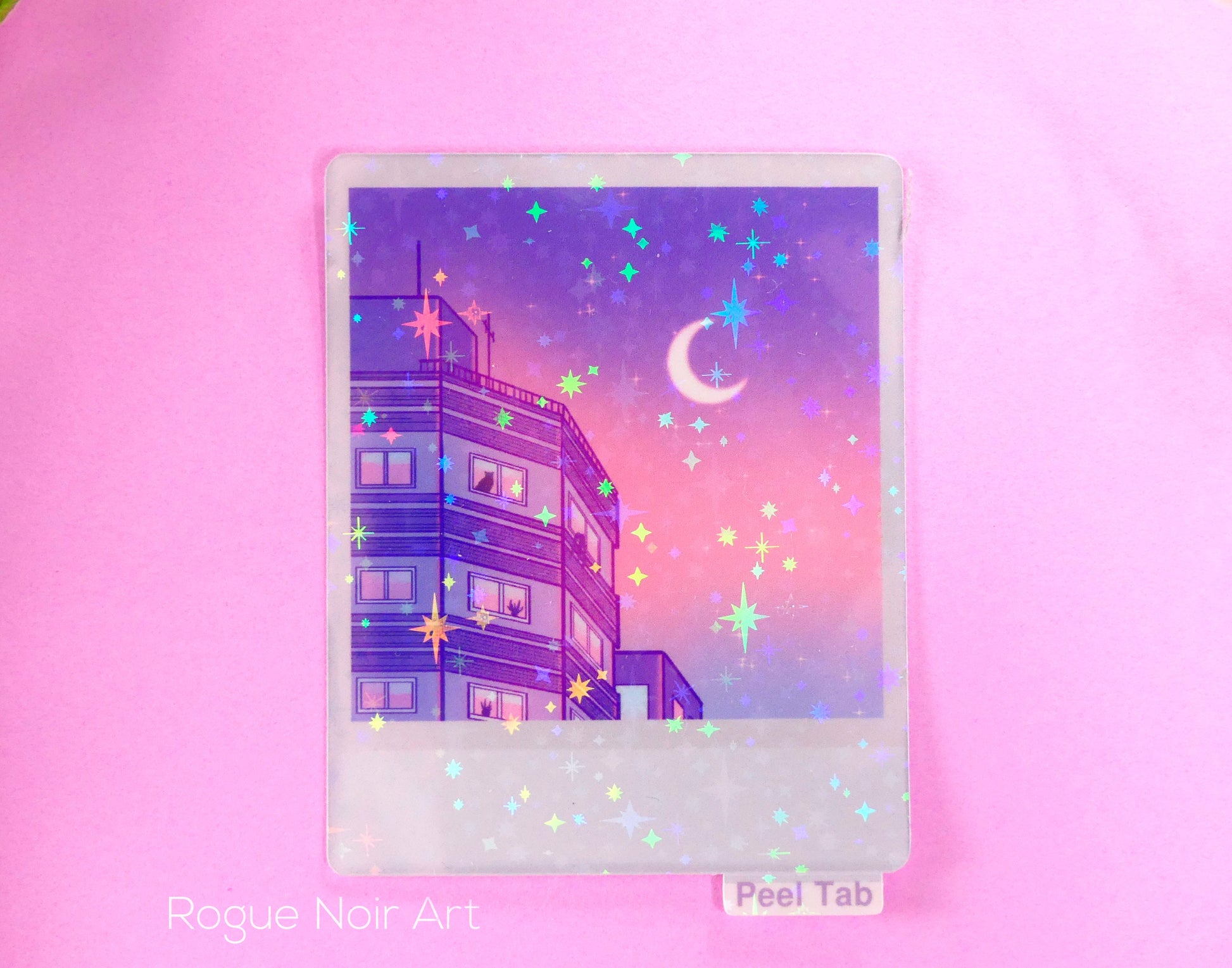 This Polaroid-style aesthetic sparkles with a holographic finish. Made from water resistant vinyl, it measures approximately 2.75 inches high by 2.25 inches wide. The peel tab is for easy peeling--no more struggling to get the backing off and damaging your sticker in the process!sticker was drawn, designed, and created by me! Art by me.