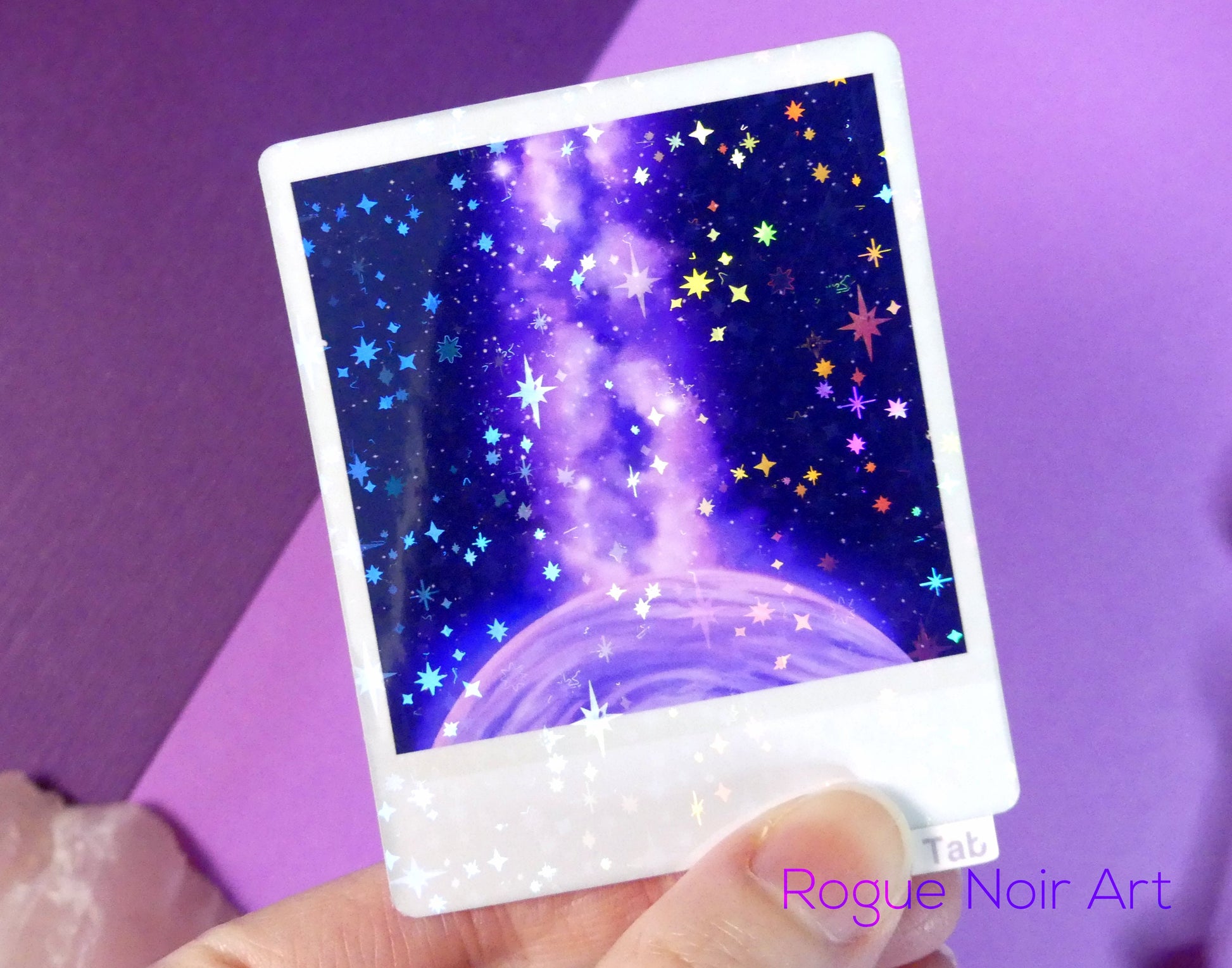 This holographic Polaroid-style sticker depicts a purple galaxy rising over a distant purple planet. Finished with a sparkling holographic laminate. Sticker measures approximately 2.75 inches high by 2.25 inches wide. The peel tab is for easy peeling--no more struggling to get the backing off and damaging your sticker in the process!