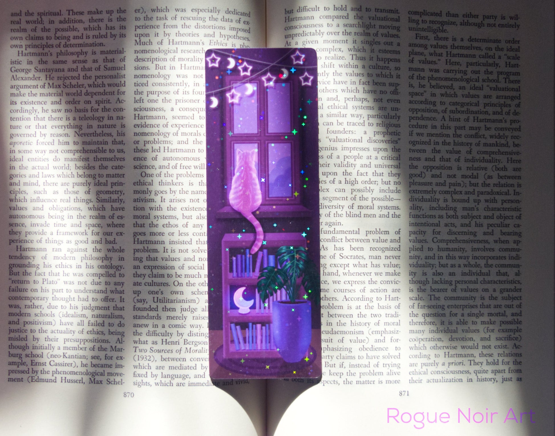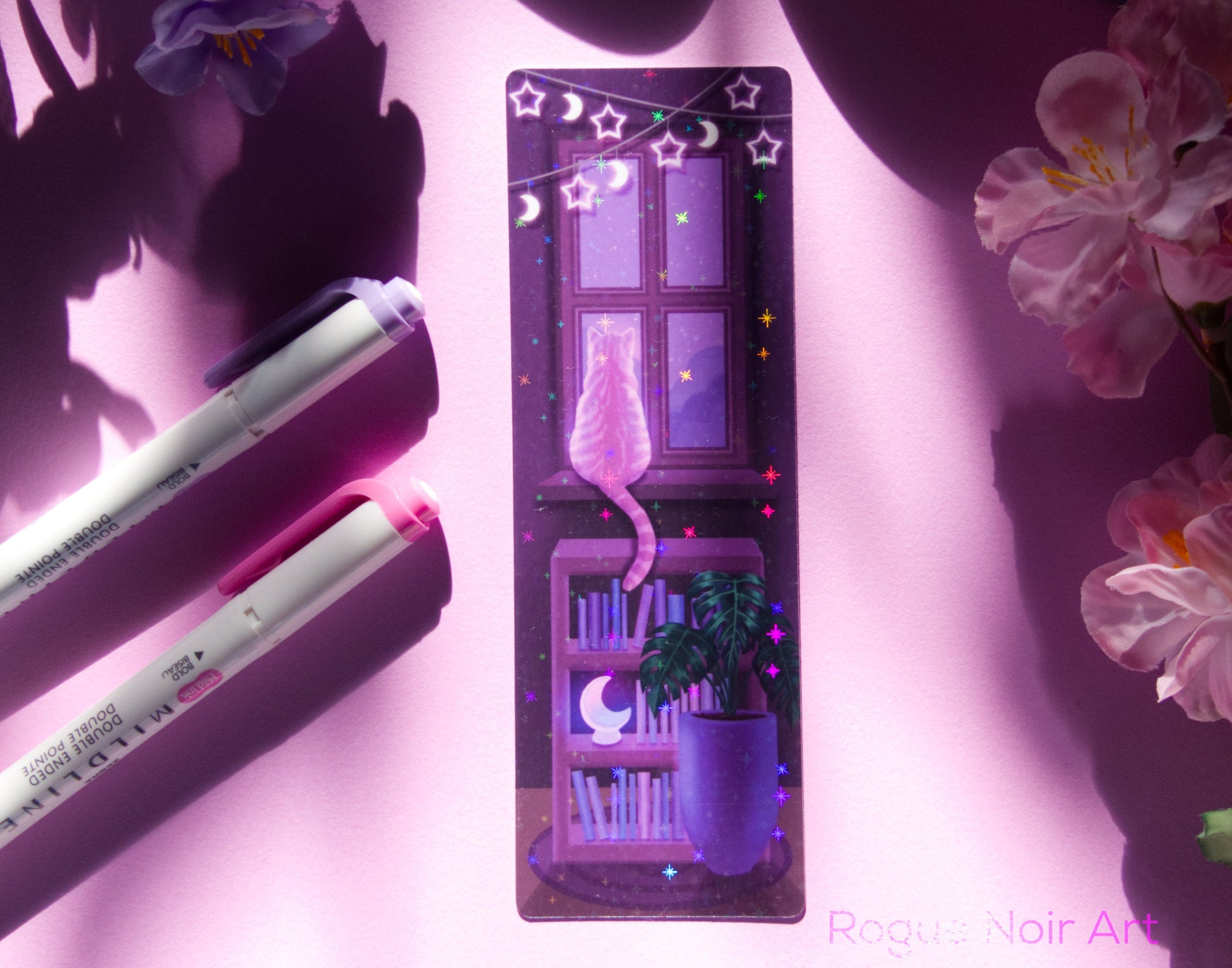 This holographic aesthetic bookmark features a dreamy scene of a cat looking through a nighttime window, complete with a little bookshelf and cozy plant. It is completed with a holographic starry finish and measures approximately 2.25x6.25 inches.