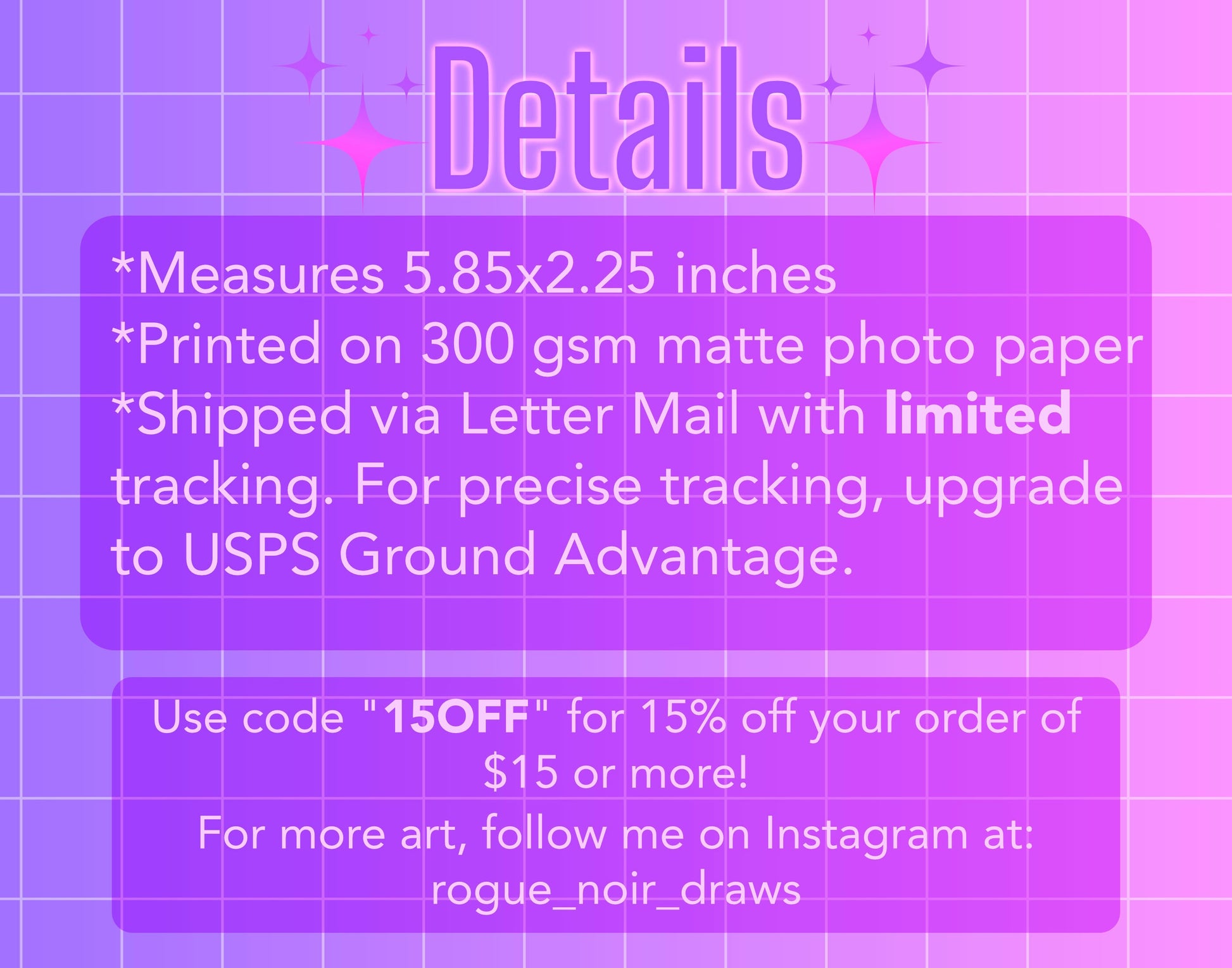 This holographic bookmark measures 5.85x2.25 inches and is printed on 300gsm art paper. Single sided; back is a plain pattern.