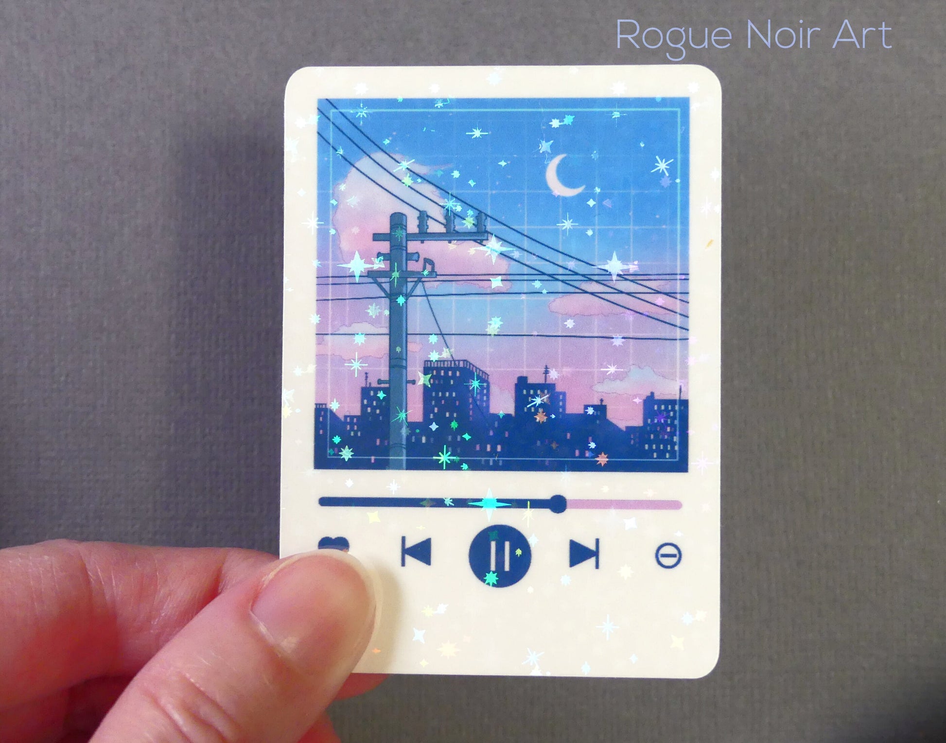 This holographic lofi aesthetic depicts a music player with lofi style city scene complete with dreamy clouds. This vinyl sticker is water resistant and is sealed with a sparkling holographic laminate. If you use it on your water bottle, I recommend hand washing. Sticker measures approximately 2.8 inches high by 2 inches wide.