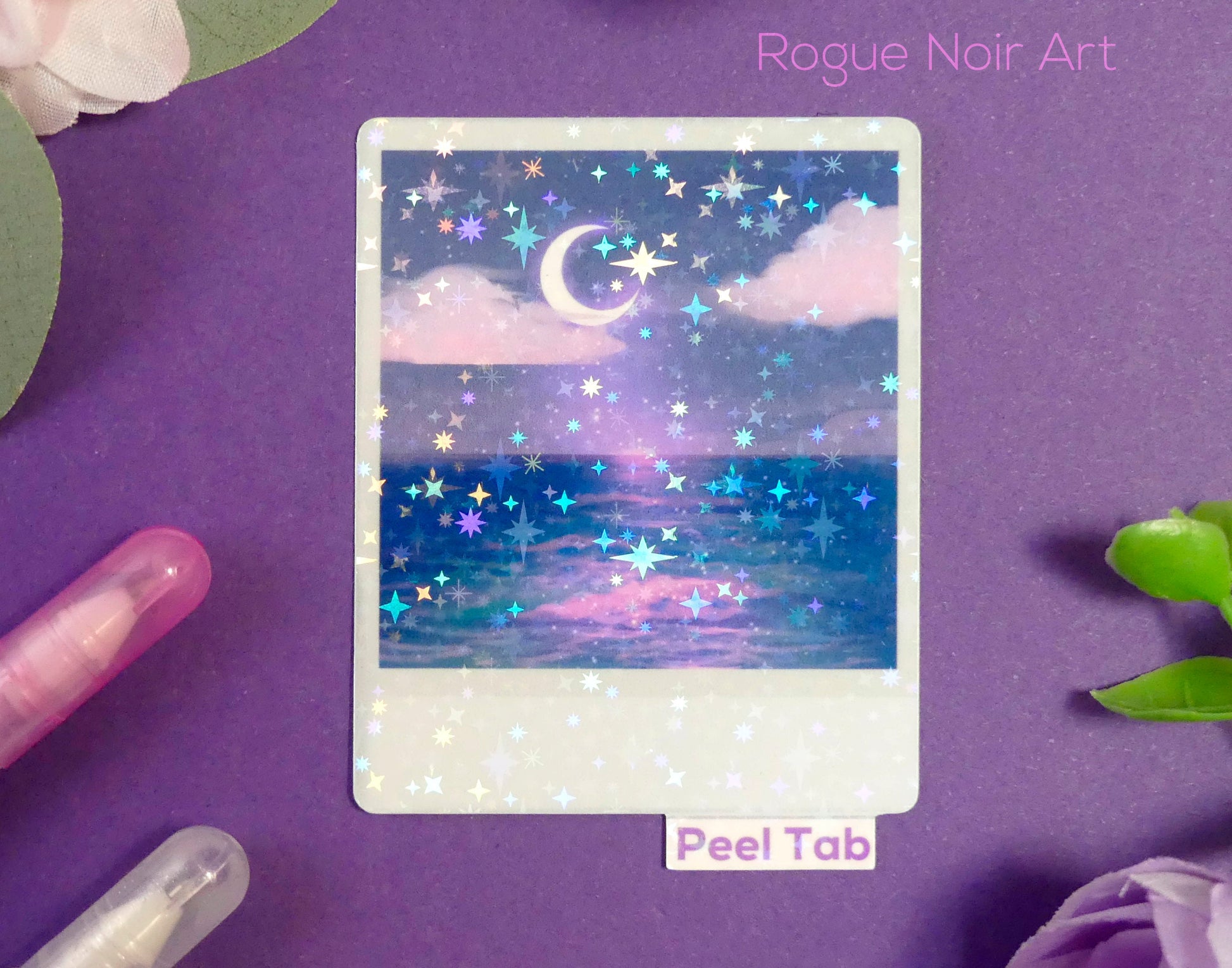 Dreamy lofi style ocean scene made with water-resistant vinyl and measuring 2.75 inches high by 2.25 inches. Finished with sparkling holographic laminate. Handwash only. Peel tab for easy peeling!