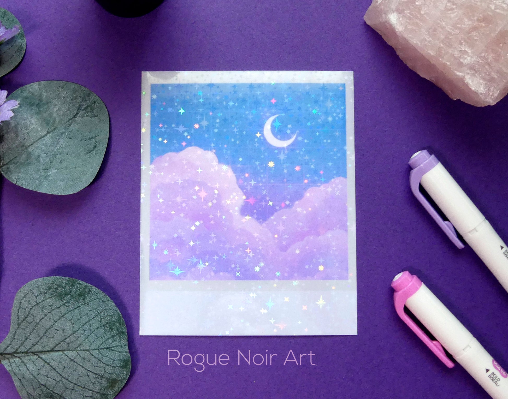 This Polaroid-style print depicts a dreamy cloud scape with soft pink and purple pastel clouds. It is finished with a sparkling holographic laminate. This print is the size of a vintage square Polaroid (3.5 x 4.25 inches) and would look great on your refrigerator, bulletin board, or wall.