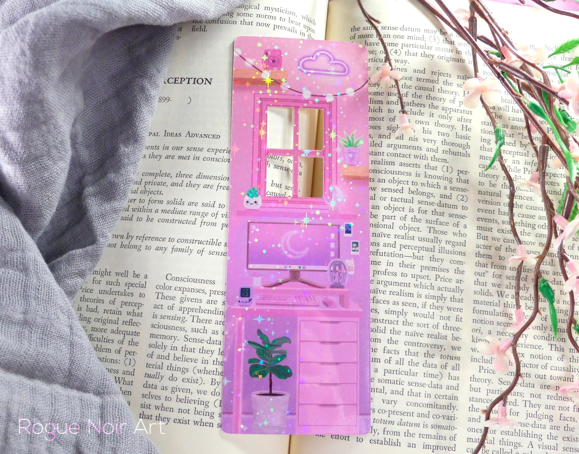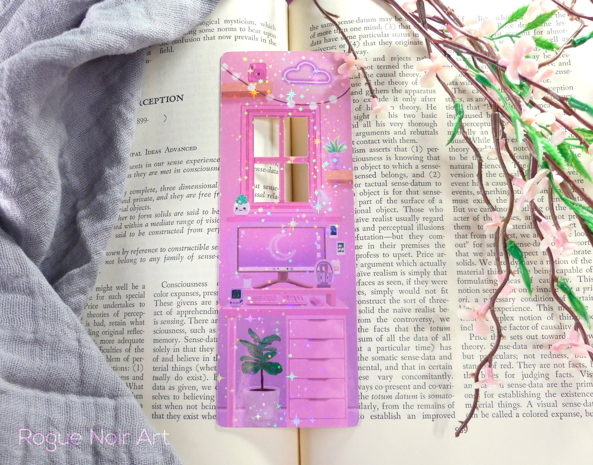This cutout bookmark to depicts a pink aesthetic room with lots of cozy details: photos on the walls, a tiny pixel art monitor, a neon cloud sign, a pink mouse, an Instax camera, a glowing moon lamp, and of course, lots of plants. The windows are cutout so you can see through them.