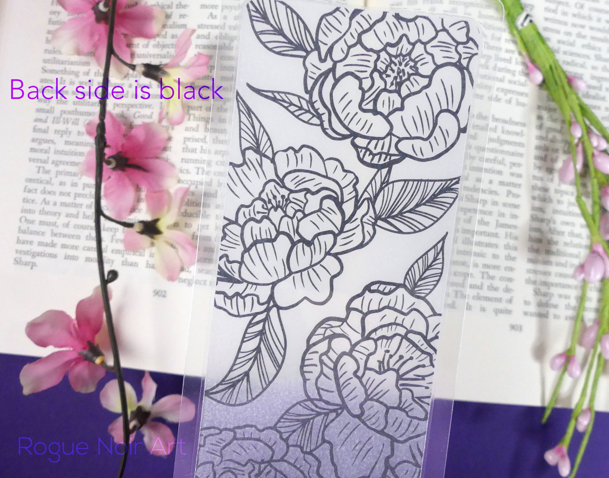 This peony flower bookmark measures approximately 2.25 x 6.5 inches and features lineart of peony flowers on lightly textured vellum. Laminated with lamination with a clear border. The back side of the design is black.