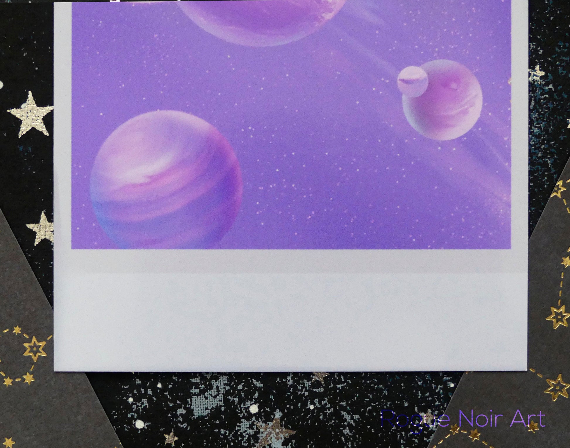 This Polaroid-style art print was created by me and depicts a pastel space scene, complete with dreamy purple planets. Perfect for anyone who's into dreamy aesthetics or space art. This print is the size of a vintage square Polaroid (3.5 x 4.25 inches) and would look great on your refrigerator, bulletin board, or wall. Printed on 300 gsm soft gloss photo stock. The texture of the print is smooth with a very subtle texture.